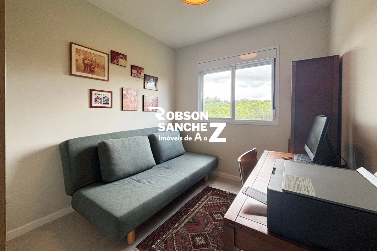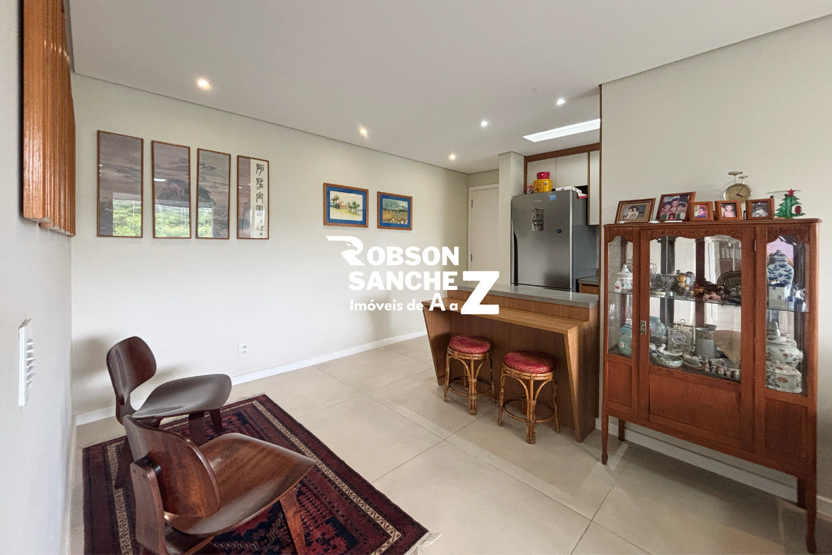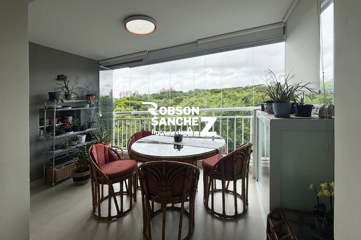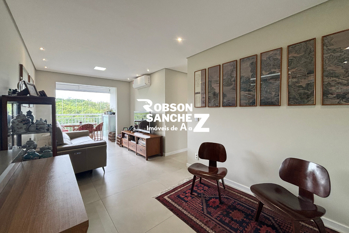 A sala é espaçosa, comporta dois ambientes, possui ar-condicionado e se integra à varanda gourmet com vista permanente para o bosque, um ambiente perfeito para relaxar ou receber amigos com conforto e tranquilidade.