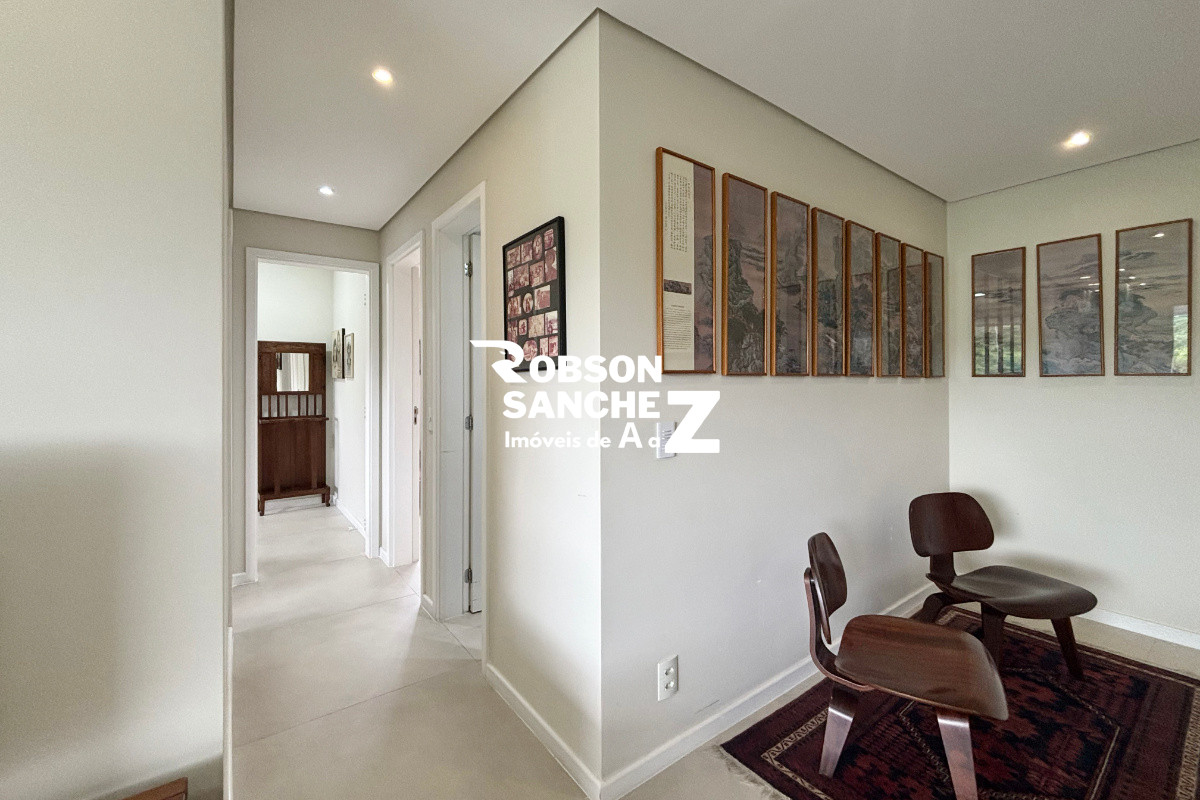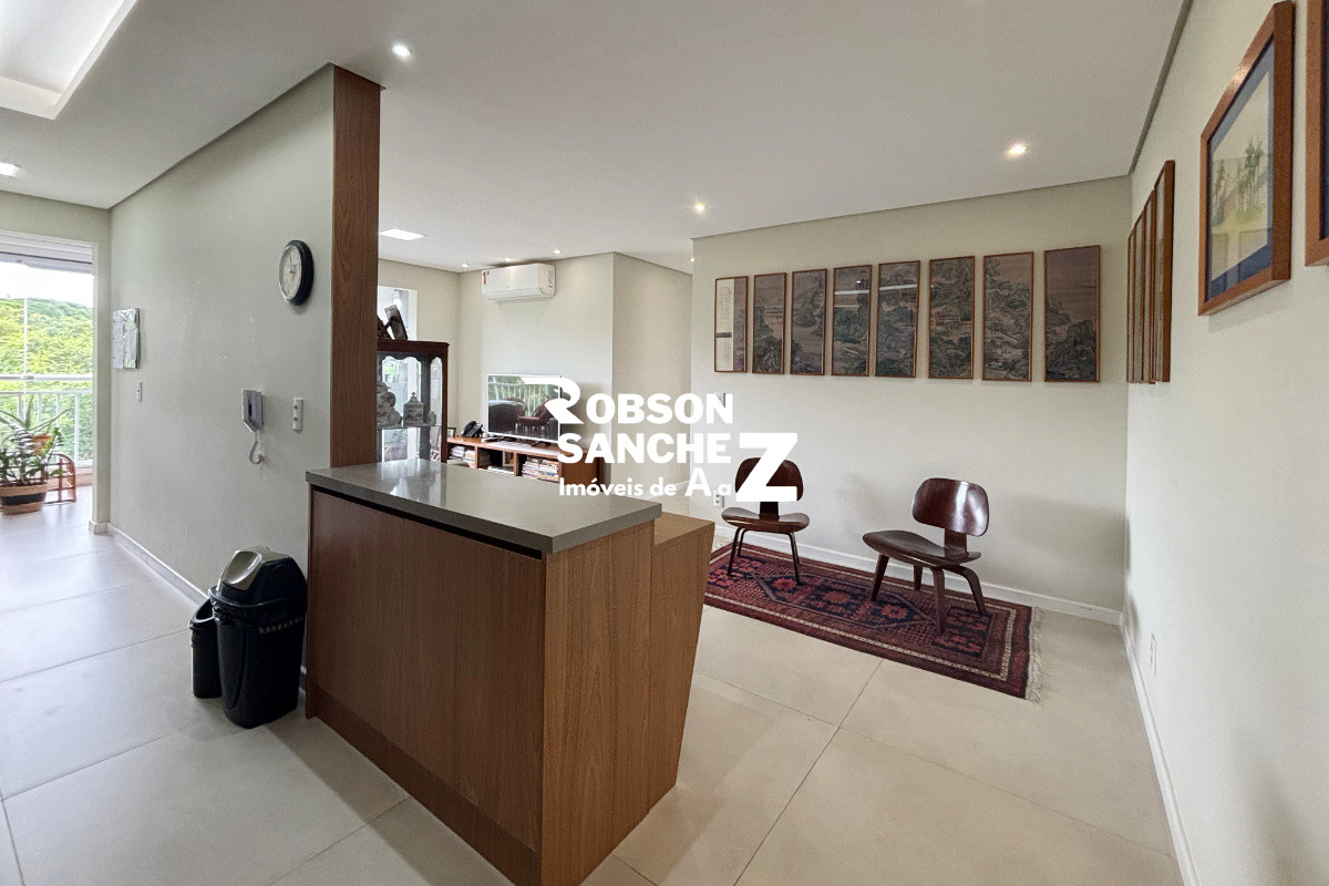 A sala é espaçosa, comporta dois ambientes, possui ar-condicionado e se integra à varanda gourmet com vista permanente para o bosque, um ambiente perfeito para relaxar ou receber amigos com conforto e tranquilidade.